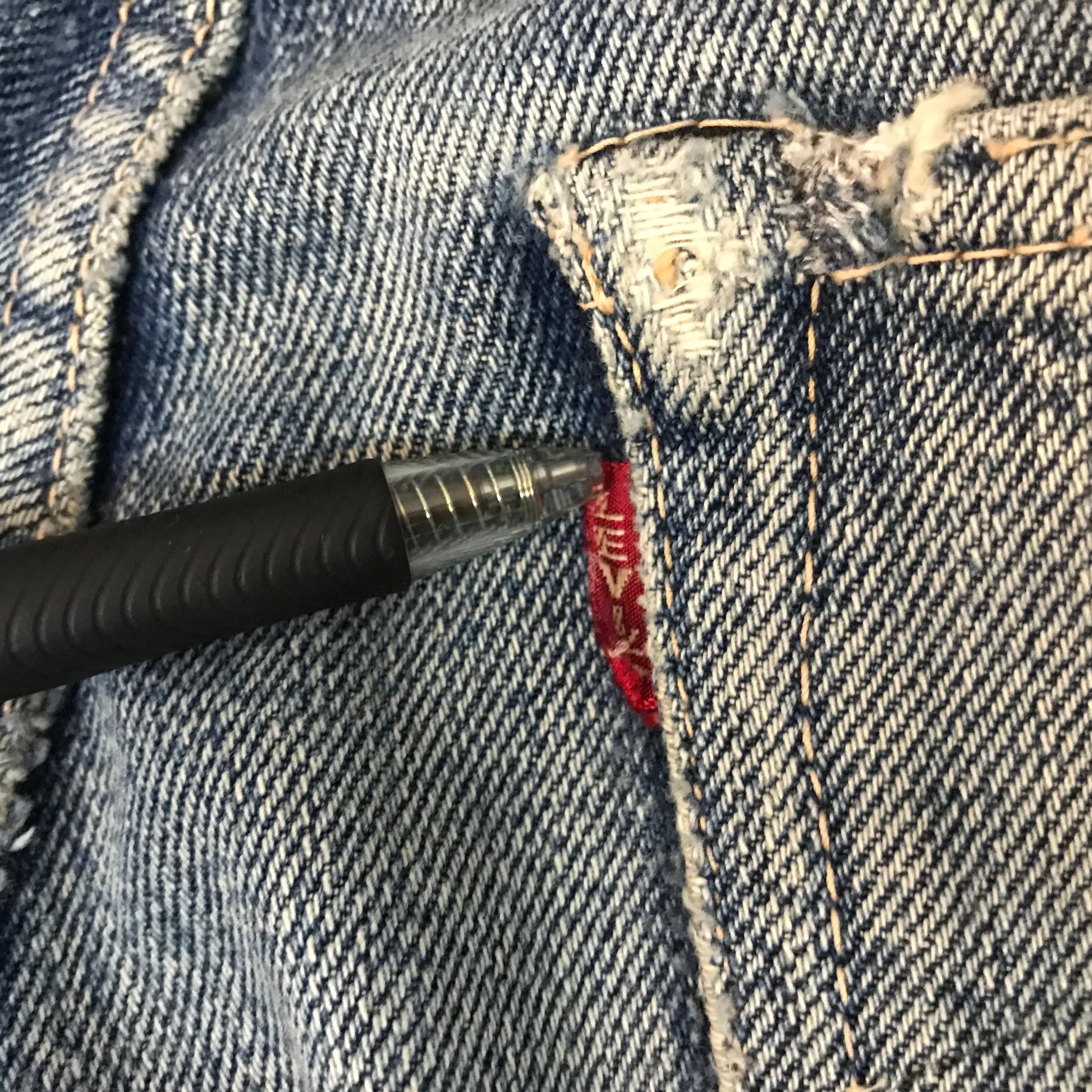 写真にあるように左足ももの辺りに薄くなっている箇所があります。